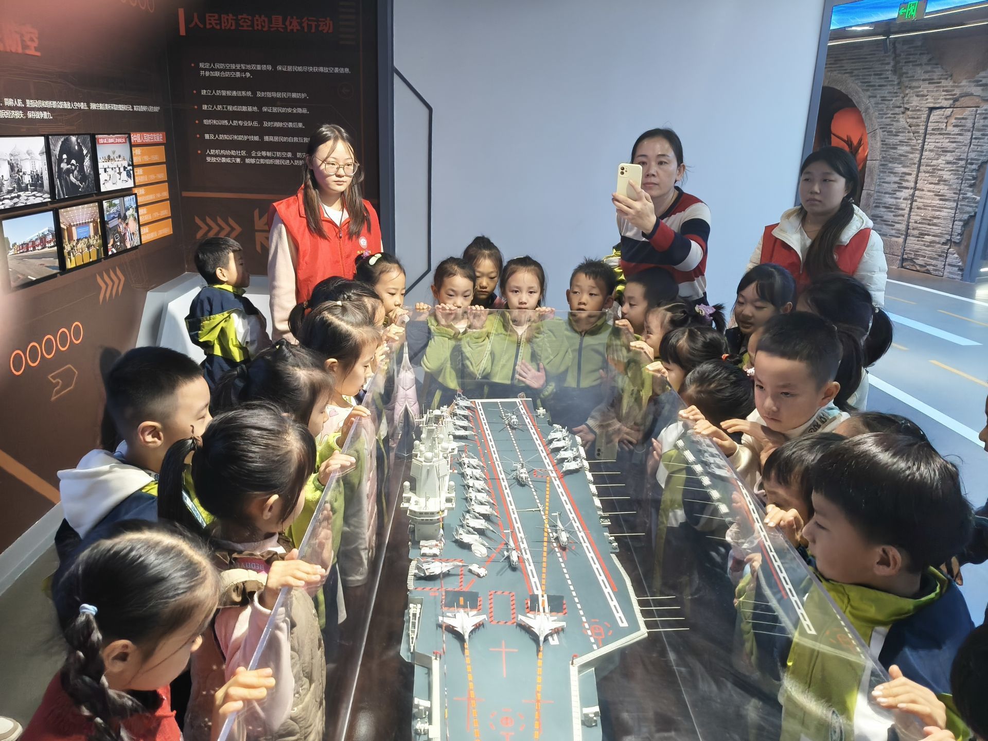 在“歷史戰(zhàn)爭(zhēng)展區(qū)”,孩子們透過影像對(duì)崢嶸歲月有了片刻的莊重回望。而這份安靜,在進(jìn)入“全球軍武博覽”的瞬間便被點(diǎn)燃——當(dāng)按戰(zhàn)斗序列布設(shè)的武器模型赫然呈現(xiàn),隊(duì)伍里立刻爆發(fā)出陣陣驚嘆。孩子們瞬間被正中央的航母模型吸引,興奮地圍攏上去,一雙雙小手隔著玻璃指點(diǎn),眼中滿是興奮與向往?!拔议L(zhǎng)大要駕駛最威風(fēng)的戰(zhàn)機(jī),保衛(wèi)祖國(guó)的藍(lán)天!”小班長(zhǎng)崔殿瀟的聲音格外響亮。