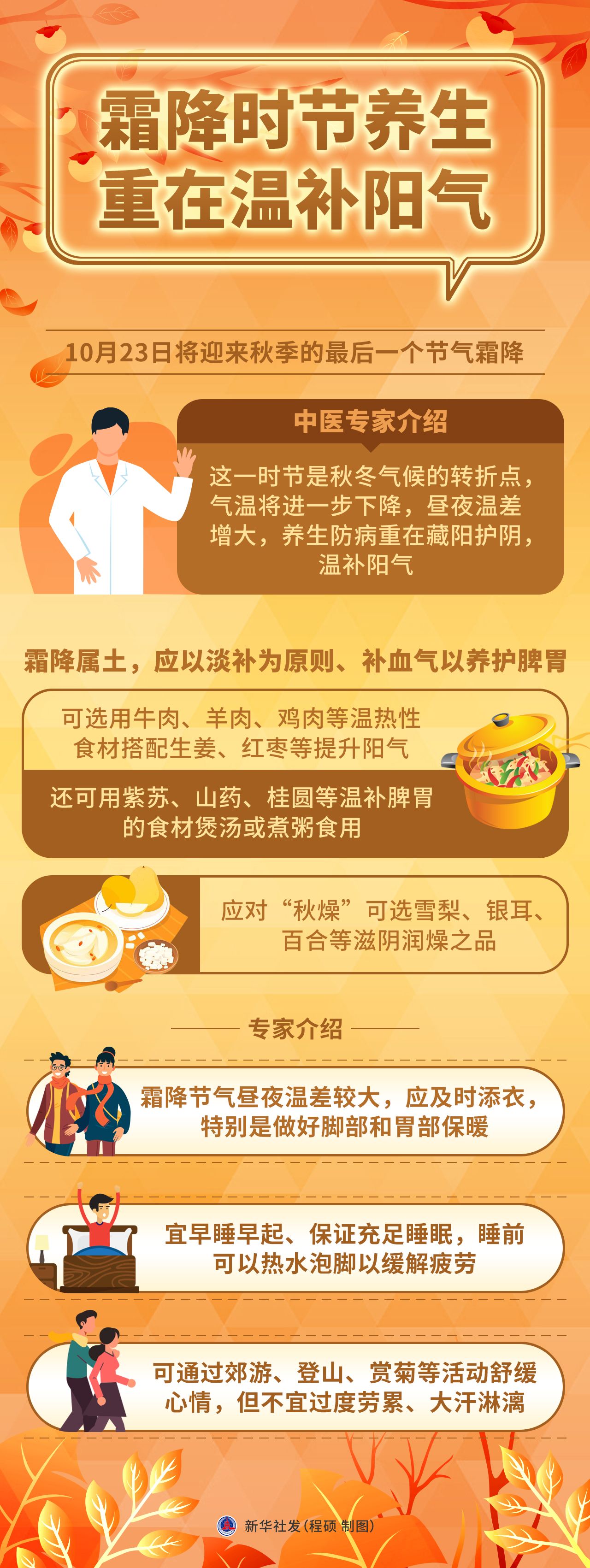 10月23日將迎來秋季的最后一個節(jié)氣霜降。中醫(yī)專家介紹,這一時節(jié)是秋冬氣候的轉折點,氣溫將進一步下降,晝夜溫差增大,養(yǎng)生防病重在藏陽護陰,溫補陽氣。