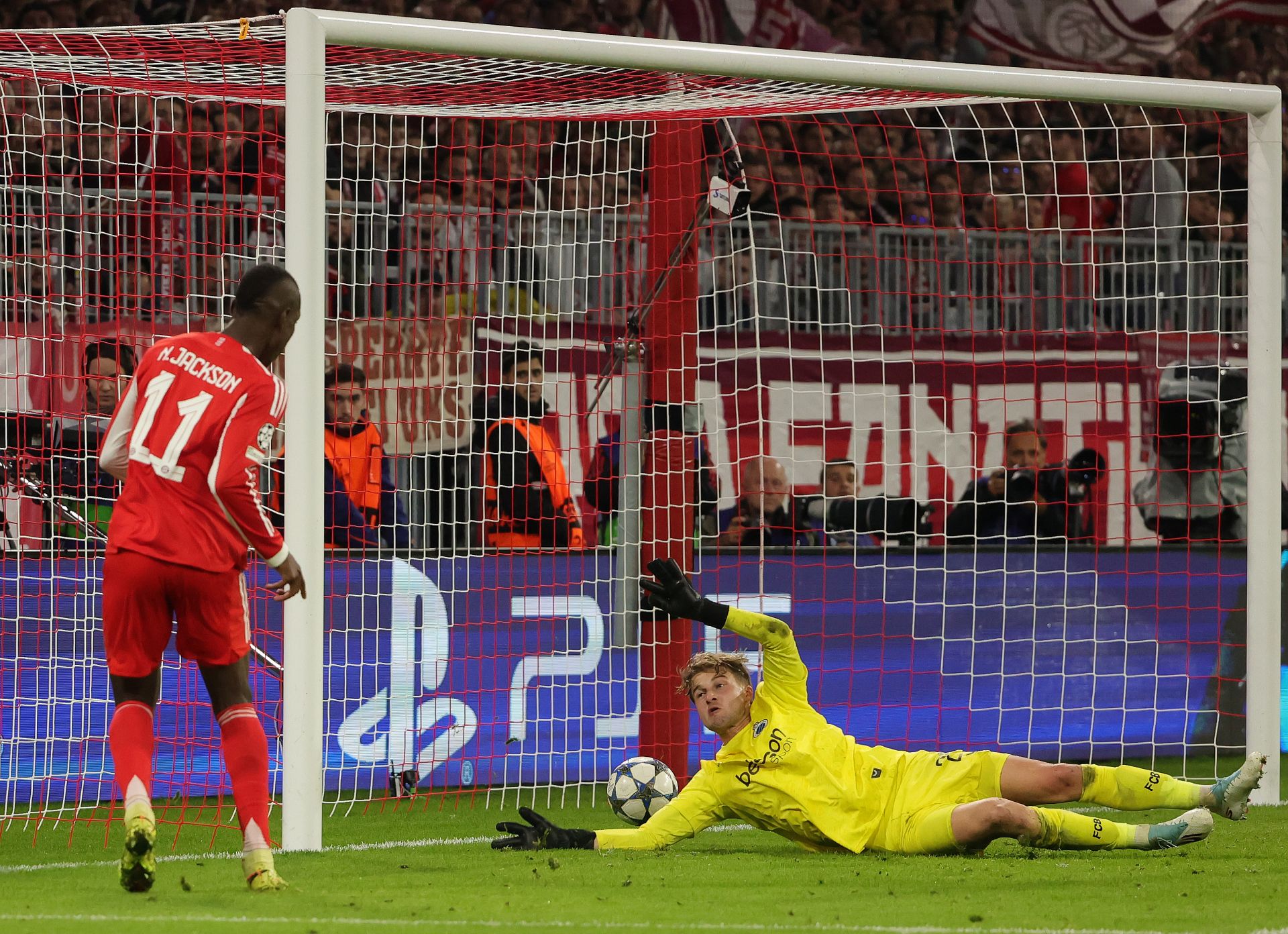 10月22日,拜仁慕尼黑隊球員雅克松(左)在比賽中射門得分。