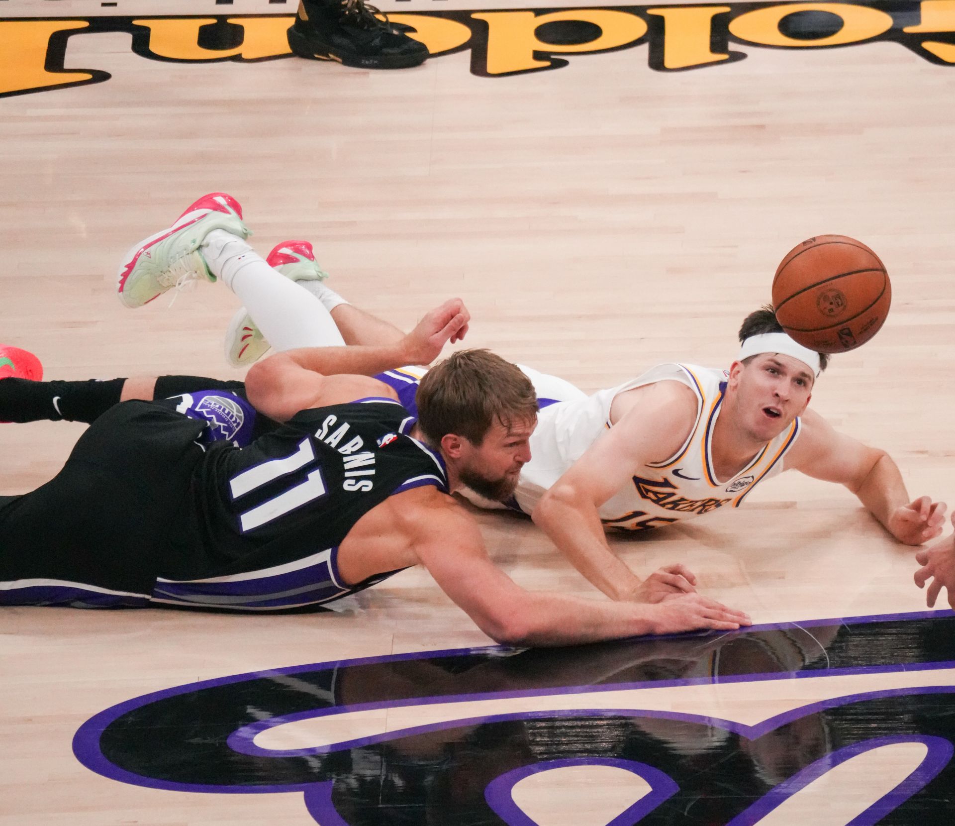 10月26日,湖人隊球員里夫斯(右)和國王隊球員薩博尼斯在比賽中拼搶。