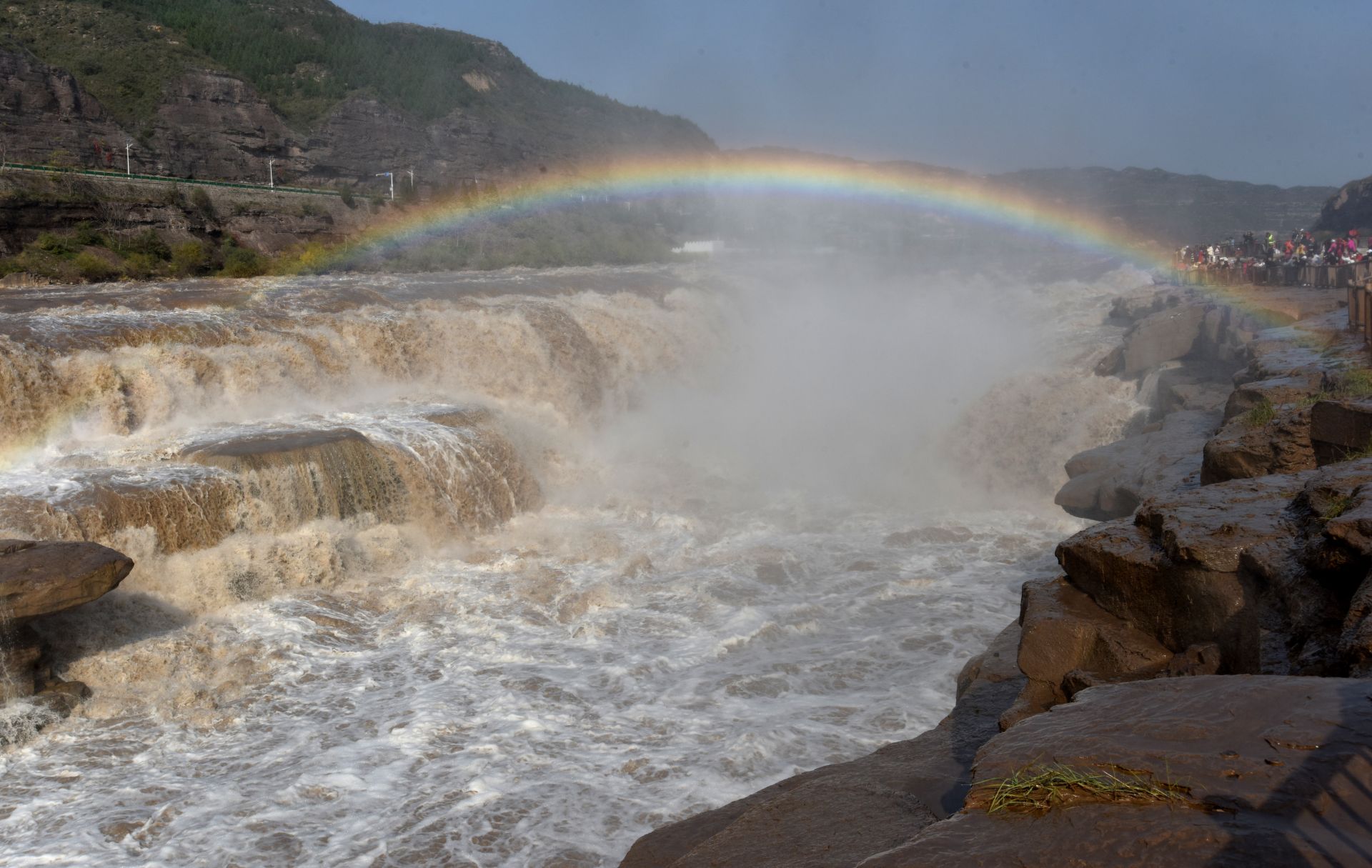 10月27日,位于山西吉縣和陜西宜川縣交界的黃河壺口瀑布景區(qū)天氣晴好,飛濺的水霧在陽(yáng)光照射下,形成一道壯美的“彩虹橋”。