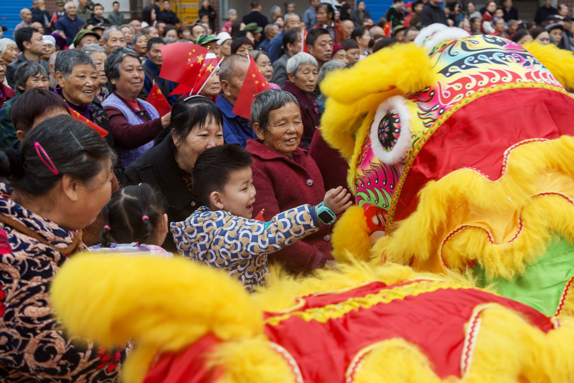 10月26日,在四川省達州市達川區(qū)雙廟鎮(zhèn)魏塘坡村慶祝重陽節(jié)活動中,民間藝人為老人們進行獅舞表演。